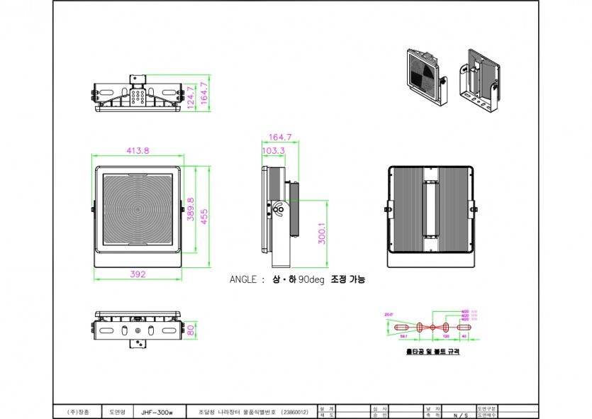 페이지 정보 목록 본문 JHF-300W 물품식별번호 23860012 제품사양 사이즈 413.8*389.8*164.7 초기광속 43,779 상관색온도 5,372 연색지수 83 역률 0.98 자료다운로드 외형도 0.제품명 : JHF-300W1.초기광속[LM] : 43,7792.상관색온도[K] : 53723.연색지수[Ra] : 83 4.역률 : 0.98