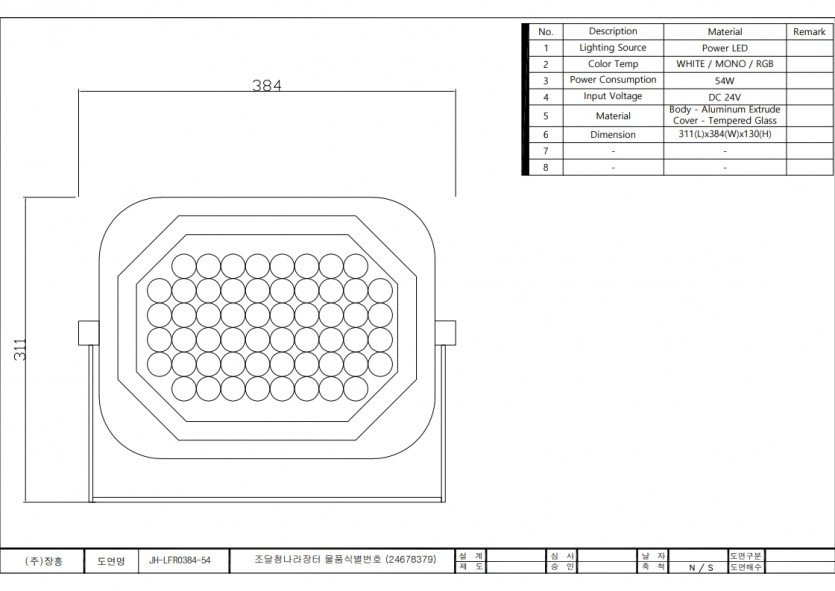 페이지 정보 목록 본문 JH-LRF0384-54,54W 물품식별번호 24678379 제품사양 소비전력 54W 사이즈 384*311*130 재질 알루미늄 정격전압 DC24 자료다운로드 외형도 .
